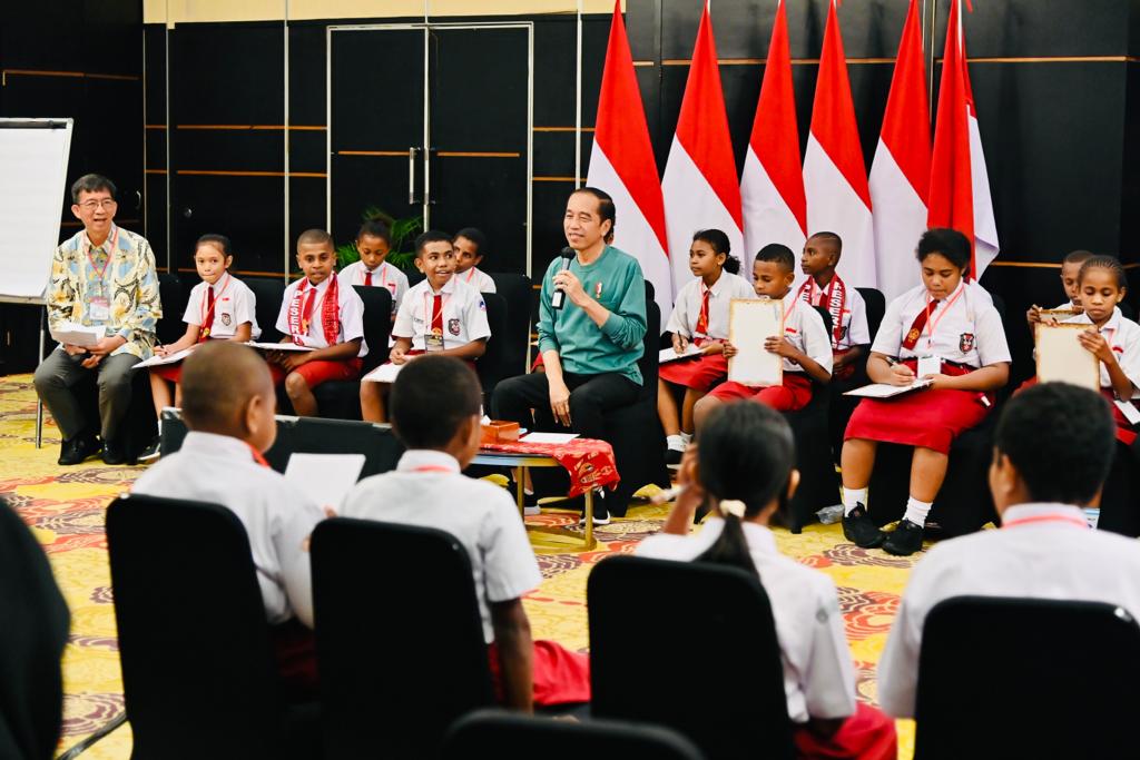 JAYAPURA, Redaksipotret.co – Presiden Joko Widodo (Jokowi) bertemu dengan anak-anak pelajar Papua di Ballroom Cendrawasih, Swiss-Belhotel, Kota Jayapura, Provinsi Papua Jumat (7/7/2023).