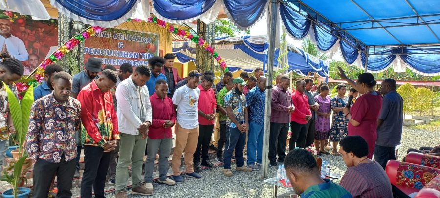Pengukuhan Tim Pemenangan Distrik Hengki Bayage melalui doa yang dipimpin Vicaris Adriana Manggo, Gembala Efata Kampwloker. (Foto : Syahriah Amir)