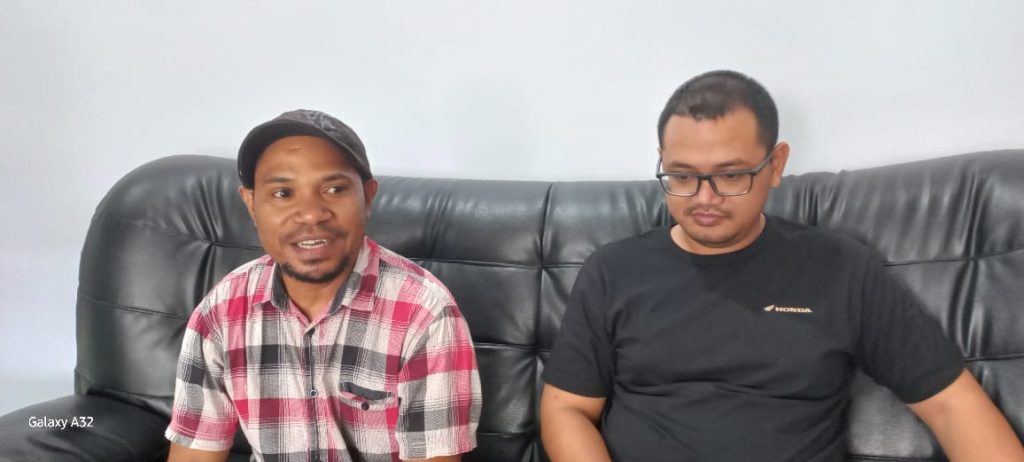 Adm and Fin Manager Astra Motor Papua, Bagas Fensanarko (kanan) didampingi Jhoni Silaas Wona selaku Ketua IKM Batik Ameldi Papua. (Foto : Syahriah Amir/Redaksipotret.co)
