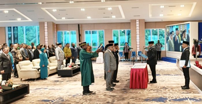 Gubernur Papua, Matius Fakhiri, resmi melantik Christian Sohilait sebagai Penjabat Sekretaris Daerah Papua, Deny Korwa sebagai Kepala Inspektorat Papua, serta Ahmad Djalali sebagai Kepala Dinas Perpustakaan dan Arsip Daerah. (Foto : Pasificpos.com)