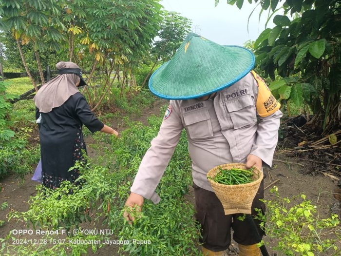 Bripka Yoyong Kuncoro salah satunya. Bhabinkamtibmas Polsek Nimbokrang ini memiliki lahan produktif tanaman cabai dan lainnya. Dengan kemampuan bertani yang mumpuni, dia berhasil beberapa kali panen dan tentu berhasil memperoleh pundi-pundi untuk menambah penghasilan keluarga.