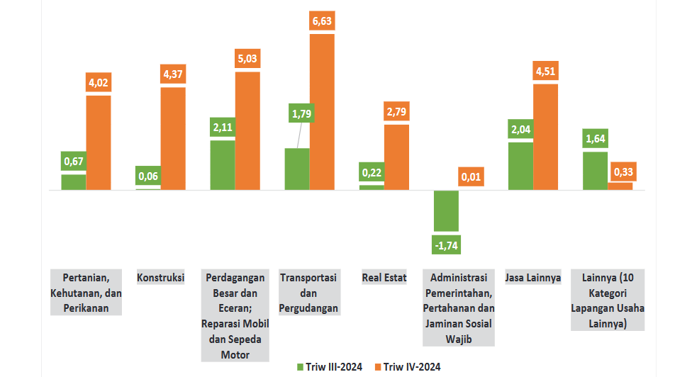 “Lapangan usaha pengadaan listrik dan gas tumbuh signifikan sebesar 8,74 persen, peningkatan ini disebabkan karena meningkatnya produksi listrik, diikuti lapangan usaha administrasi pemerintahan, pertahanan, dan jaminan sosial wajib sebesar 7,20 persen, lapangan usaha transportasi dan pergudangan sebesar 6,73 persen, lapangan usaha informasi dan komunikasi sebesar 6,14 persen, serta lapangan usaha perdagangan besar dan eceran; reparasi mobil dan sepeda motor sebesar 5,91 persen,” jelas Adriana saat merilis berita resmi statistik, Senin lalu secara daring.