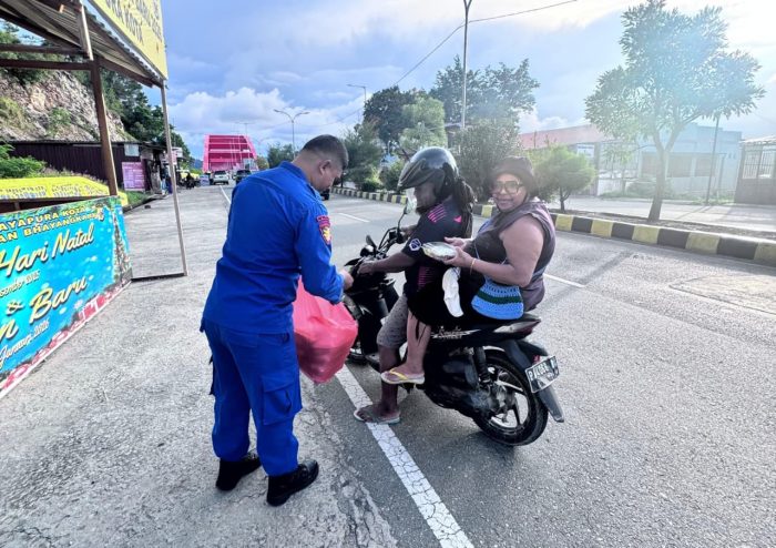 Kegiatan tersebut dilaksanakan di kawasan Jembatan Merah Youtefa, salah satu titik strategis yang ramai dilalui masyarakat. Anggota Sat Polairud dengan penuh kehangatan dan humanis membagikan makanan kepada warga serta para pengendara yang sedang melintas.