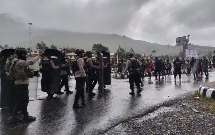 Aparat keamanan melerai pertikaian antar pendukung paslon di Puncak Jaya. (Foto : Istimewa)