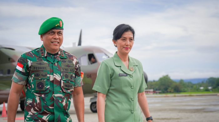 Pangdam XVII/Cenderawasih, Mayjen TNI Febriel Buyung Sikumbang didampingi Ketua Persit Kartika Chandra Kirana Daerah XVII/Cenderawasih, Ina Febriel Buyung Sikumbang tiba di Base Ops Lanud Silas Papare, Sentani, Kabupaten Jayapura, Papua. (Foto : Istimewa)