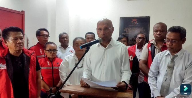 Calon Gubernur Papua nomor urut 1, Benhur Tomi Mano saat konferensi pers. (Foto : Muhammad Haikal Fahresi/Redaksipotret.co)