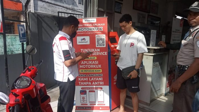 Pelanggan menggunakan aplikasi MotorkuX sebelum transaksi di bengkel resmi Honda. (Foto : Istimewa)