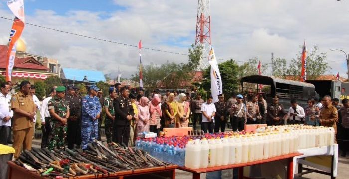 Diketahui, sebanyak 10 liter miras pabrikan, 489 liter miras tradisional dan 278 sajam yang berhasil dimusnahkan.